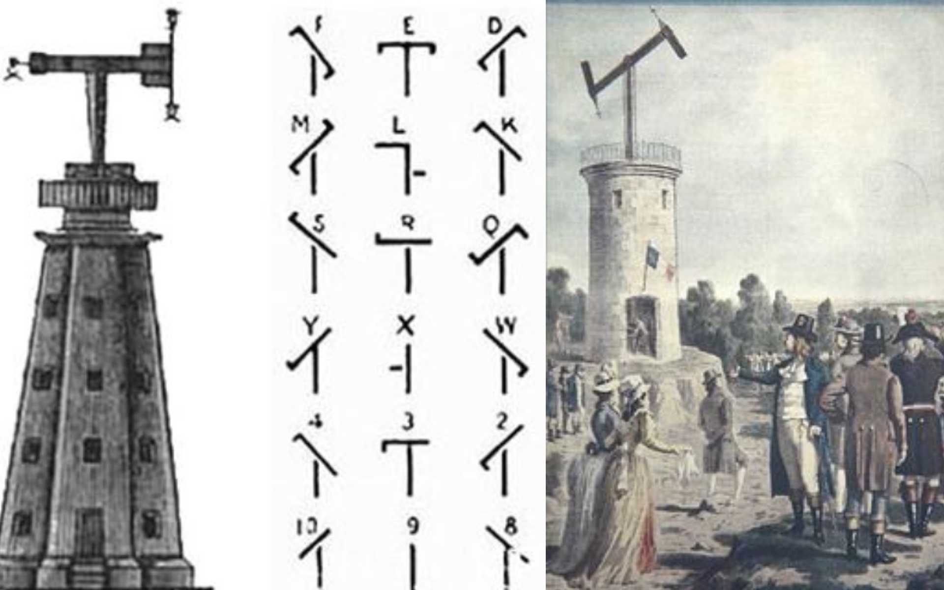 Именно во Франции произошёл большой прорыв, связанный с передачей информации. Французский механик Клод Шапп в 1789 году предложил уникальную идею, которая заключалась в создании сети башен с устройствами из планок, которые легко можно разглядеть. Внутри башни находился телеграфист, основная задача которого состояла в изменении расположения планок. Он ориентировался на ту башню, которая находилась в его видимости. Другой телеграфист копировал поступающую информацию. В результате, сообщение, проходя несколько инстанций, доходило до конечной точки.