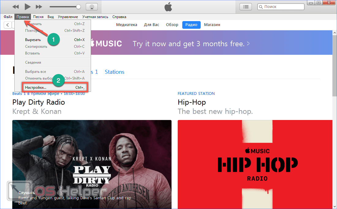 Открываем программу и нажимаем в панели управления на вкладку «Правка». В выпадающем меню переходим к отмеченному на скриншоте пункту «Настройки».