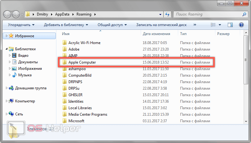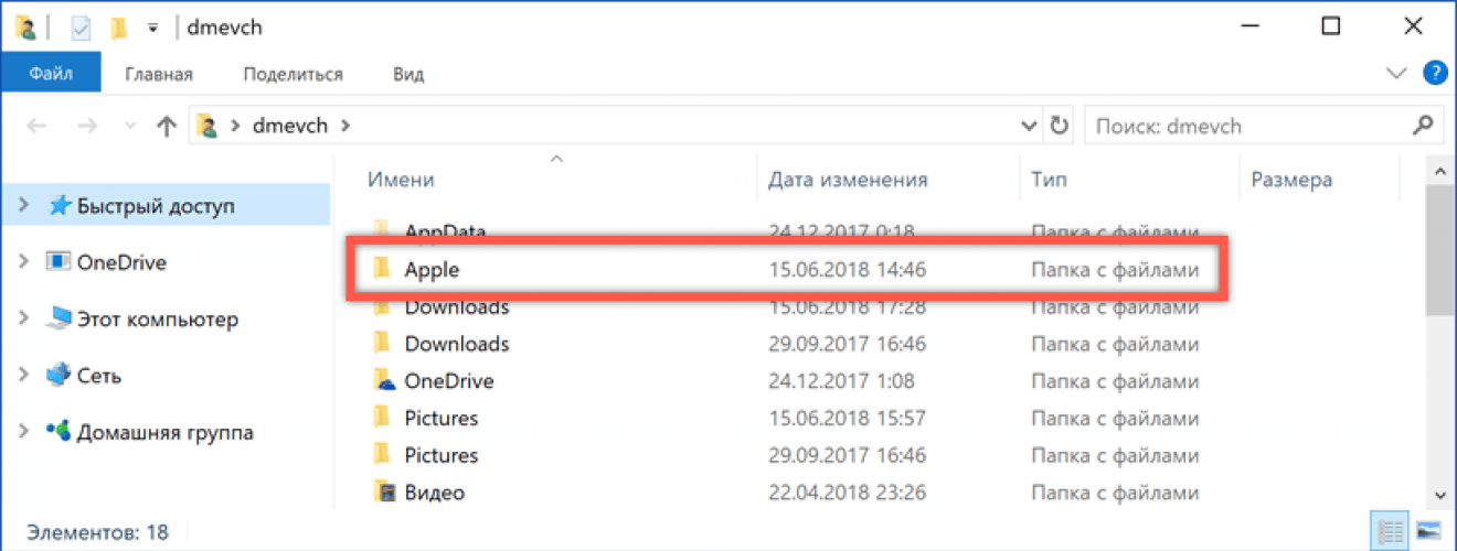 В окне Проводника в этот раз нужно искать директорию «Apple