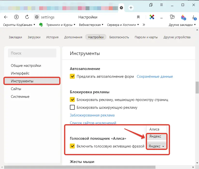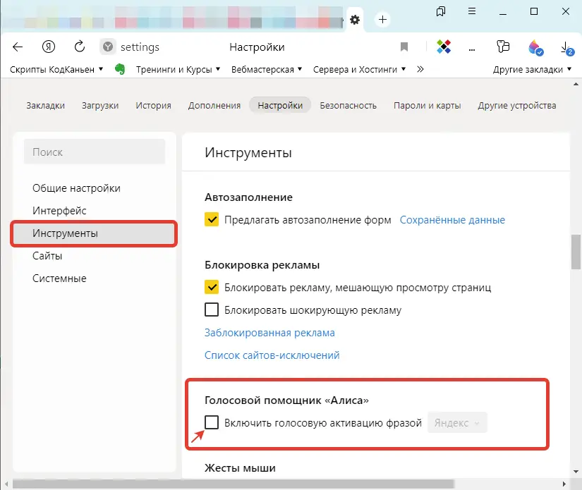 - Нас спустит вниз по странице. Найдем строчку «Голосовой помощник Алиса». Если у нас стоит галочка напротив пункта «Включить голосовой помощник Алиса», то мы убираем её. Так же можно будет убрать галочку с графы «Включить голосовую активацию фразой».