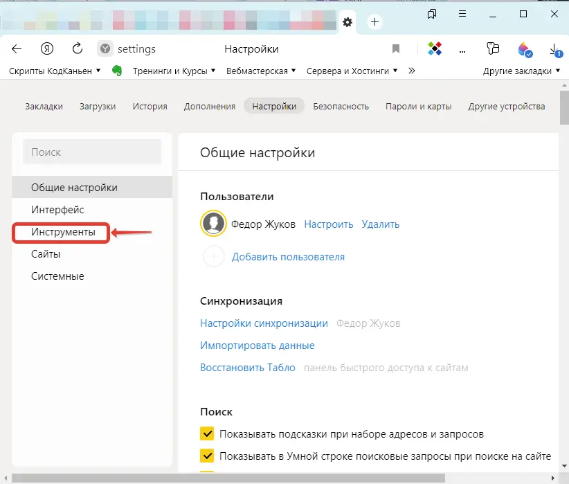 2. На странице настроек Яндекс Браузера в левом меню выберите пункт «Инструменты».