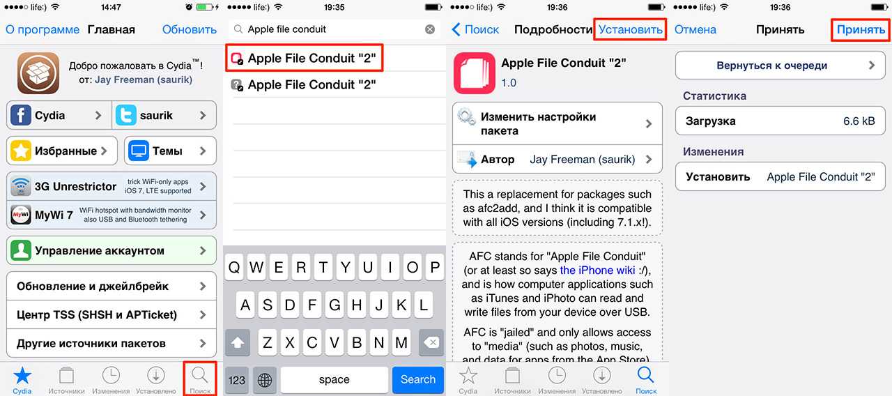 Запустите Cydia, перейдите в меню «Поиск» и введите запрос «Apple File Conduit 2». В списке с результатами поиска выберите соответствующий «твик» и тапните «Установить», а затем «Принять» (находятся в правом верхнем углу экрана).