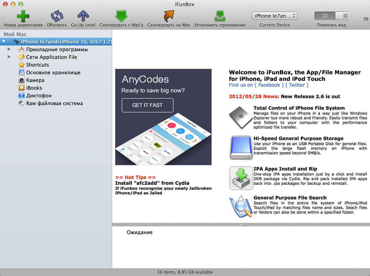 Подключите устройство к компьютеру USB-кабелем и запустите iFunBox.