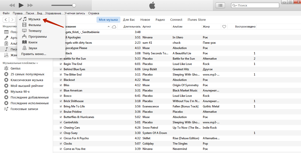 В программе iTunes есть такой раздел, называется – Музыка, именно здесь хранятся все музыкальные композиции загруженные ранее. Кстати музыка в iTunes добавляется практически так же как загружается видео, правда QuickTime ставить не обязательно. Для того чтобы попасть в раздел Музыка, в левом верхнем углу программы iTunes нажмите на контекстное меню Медиатека и выберите Музыка (как на изображении выше). Тем, кто пользуется левым боковым меню еще проще, выбираем в нем раздел Музыка и видим всю музыкальную коллекцию, которую мы сейчас чуть-чуть поудаляем.