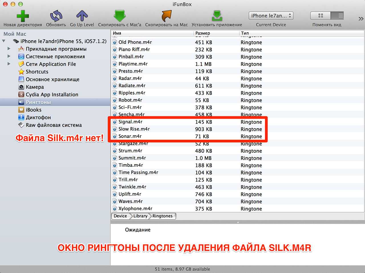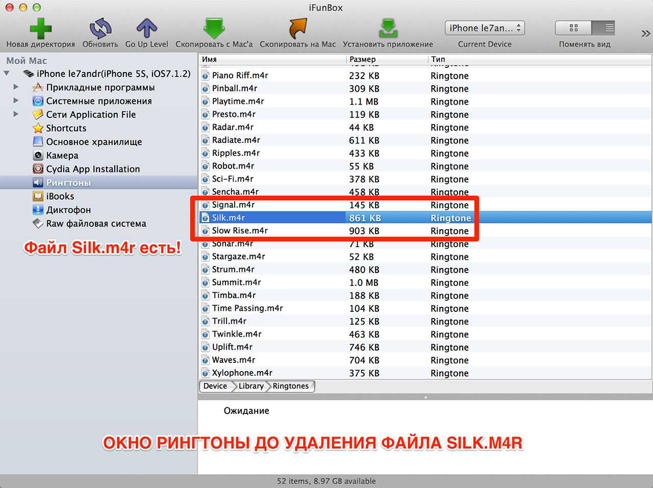 Рассказывать о том, как удалить стандартные рингтоны из iPhone мы сознательно не будем, т.к. сами этого не рекомендуем. После удаления файла рингтона из памяти устройства в «Настройки -> Звуки -> Рингтон» записи с названиями удаленных рингтонов все равно остаются, рингтон удаляется только физически. Попробуем удалить стандартный рингтон «Шелк», но сначала необходимо получить доступ к файловой системе iOS, а без джейлбрейка сделать это не получится.