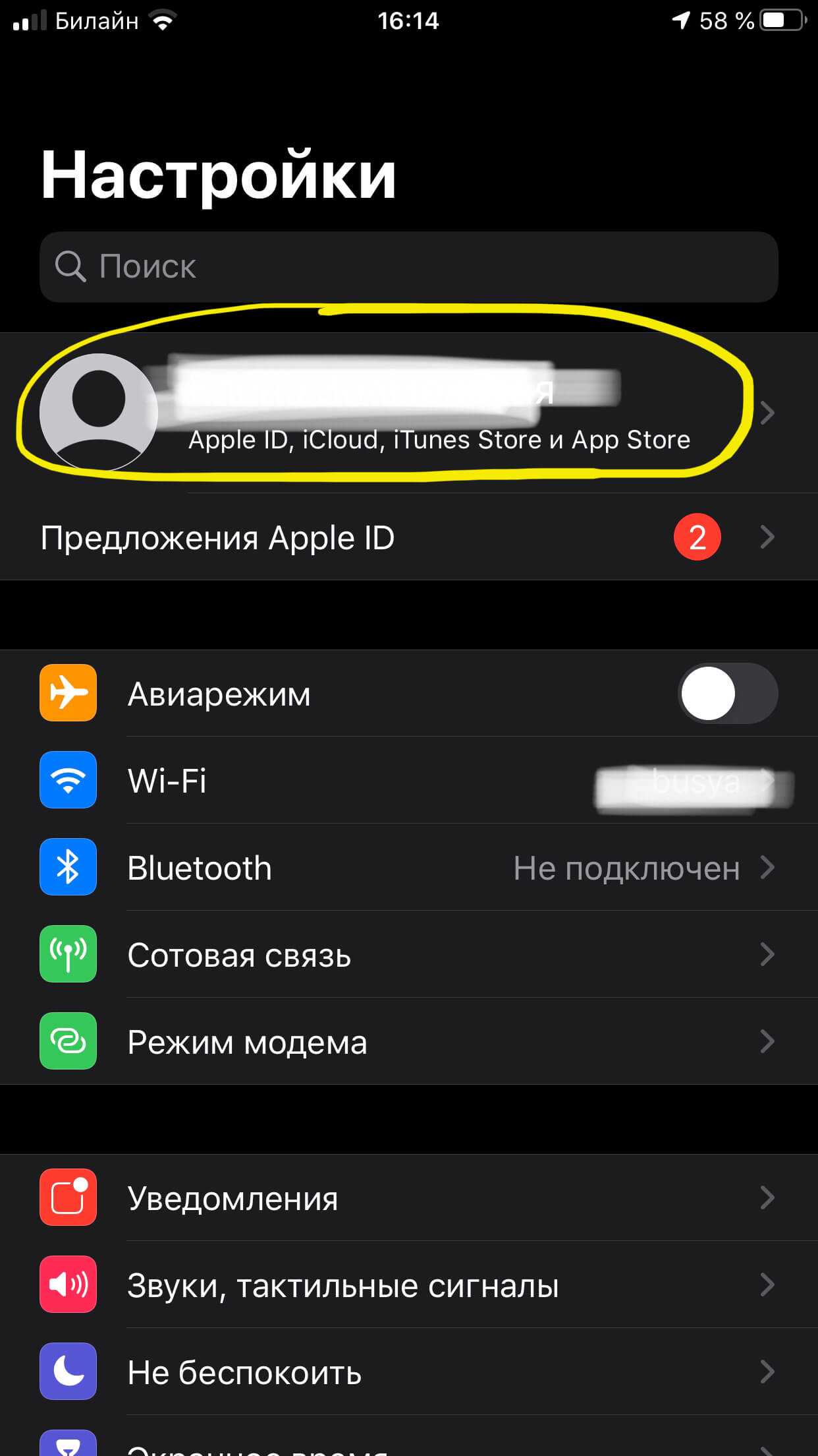 В приложении «Настройки» коснитесь своего имени и Apple ID вверху.