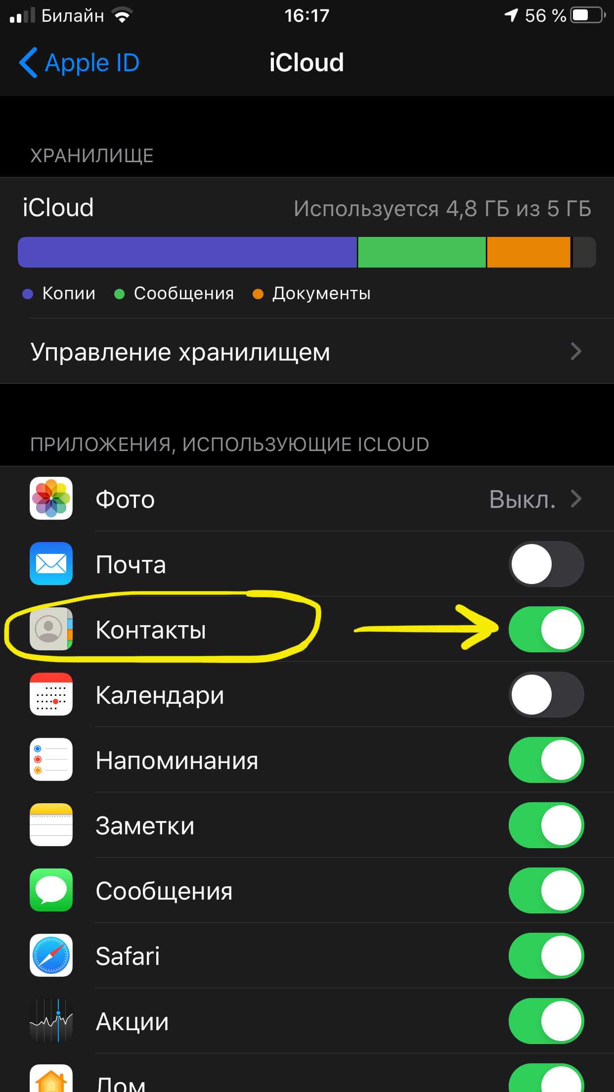 4. В разделе «Приложения, использующие iCloud» переведите переключатель «Контакты» в положение «Выкл.».