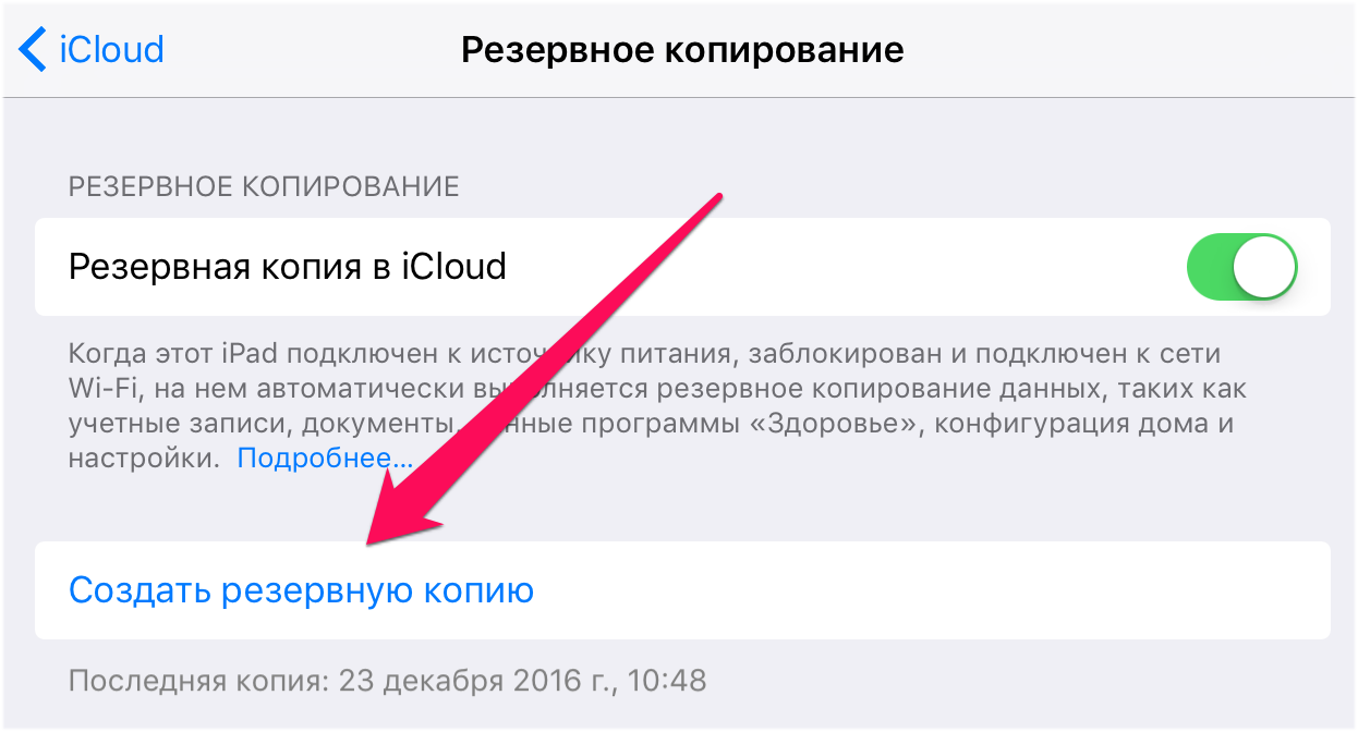 Как это сделать: нужно перейти в меню резервного копирования из раздела iCloud в системных настройках устройства (Настройки — iCloud — Резервная копия) — здесь доступны все необходимые функции.