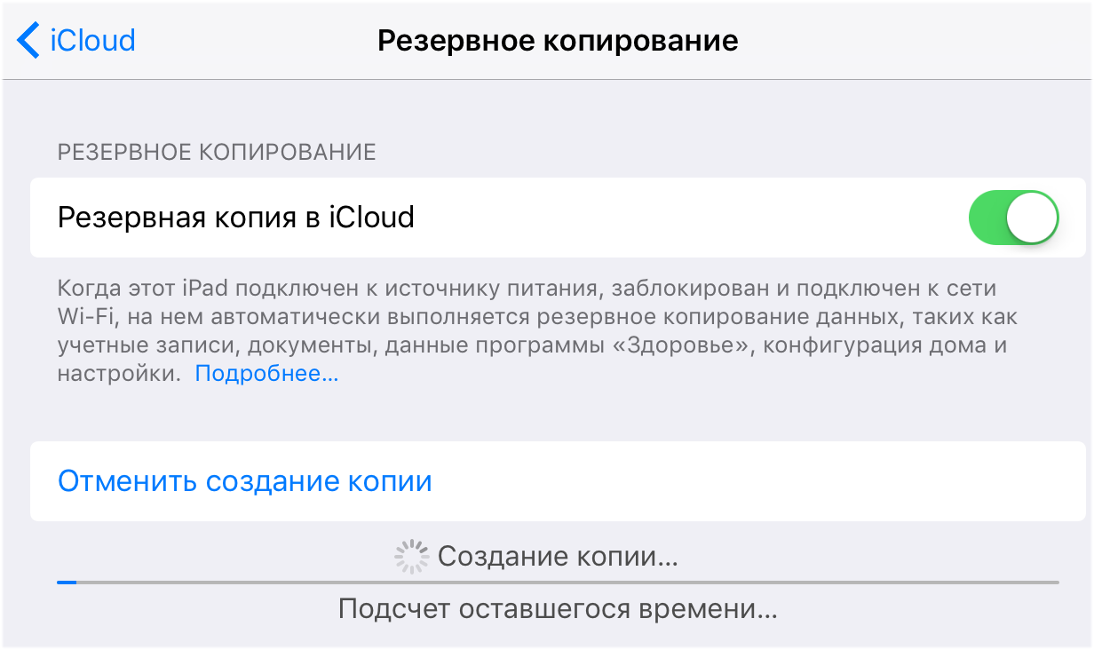 Если ваш iPhone/iPad подключен к источнику питания и к сети Wi-Fi с доступом в Интернет, и его экран заблокирован, то резервные копии в iCloud создаются автоматически ежедневно без вашего участия.