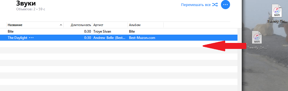 . Теперь просто перетяните файл.m4r в открывшуюся секцию Звуки.