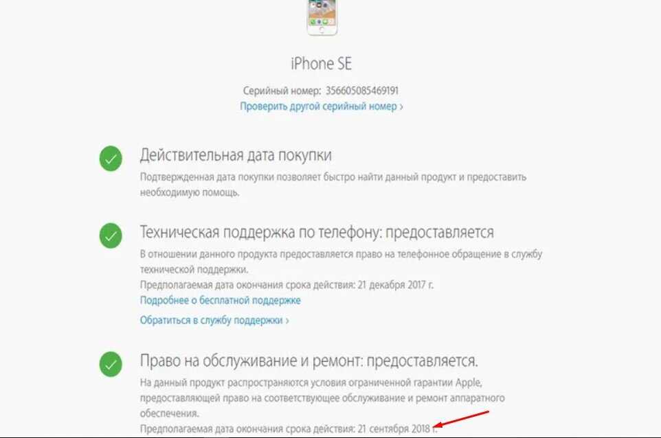 Если обозначения перед пунктами не зеленые, а желтые или красные, стоит с осторожностью подойти к покупке такого девайса. Если посмотреть на картинку выше, понятно, что у айфона SE истекает гарантия 21 сентября 2018 года