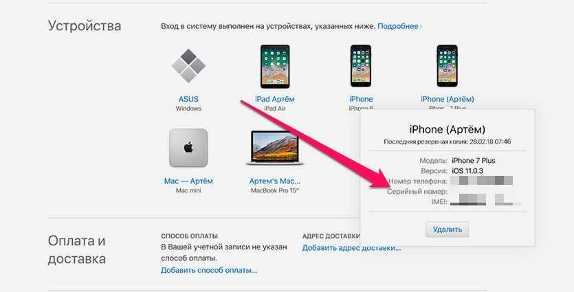 Если доступа к устройству или компьютеру нет, найти серийный номер можно на сайте appleid.apple.com. После авторизации под своим Apple ID нужно найти девайс в разделе Устройства и нажать на него.