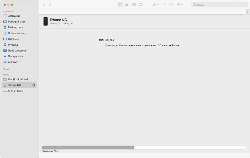 ❺ Если файл выбран верно, начнётся процесс восстановления iOS 14 на гаджете, на котором установлена iOS 15.