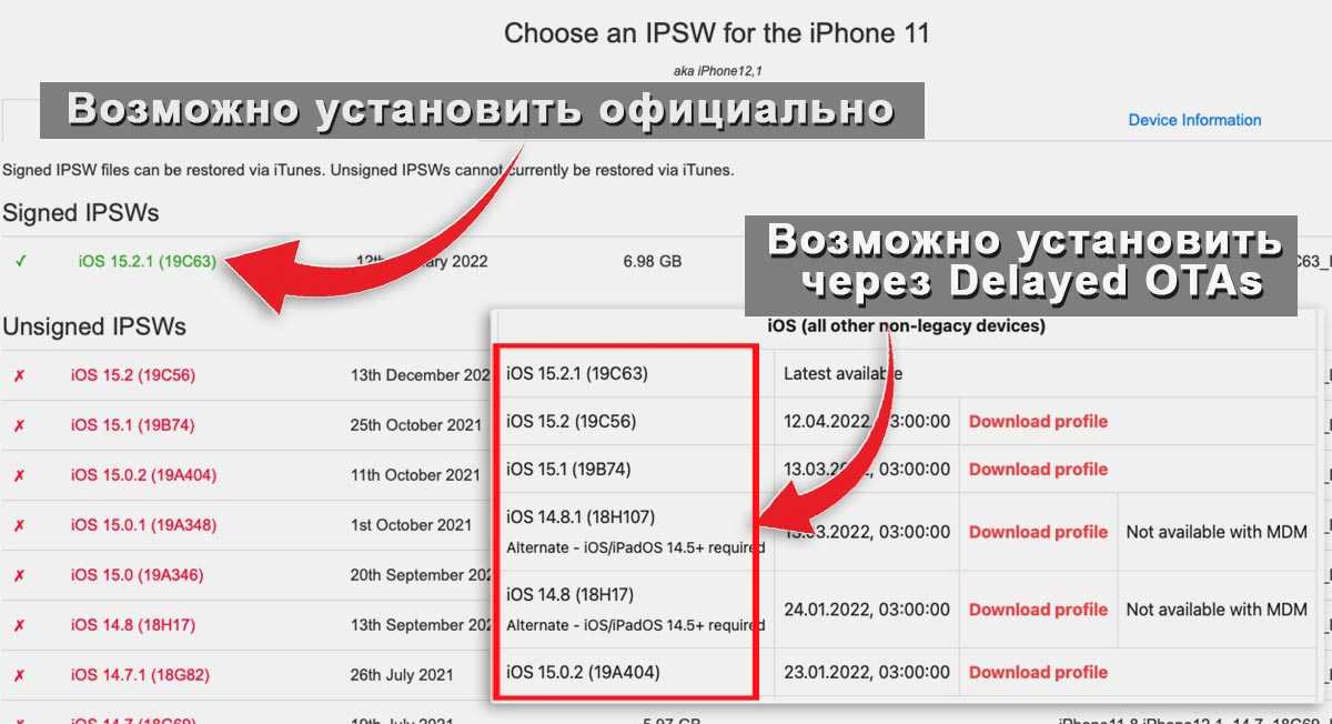 Например, если зайти на сайт с прошивками ipsw.me и выбрать iPhone 11, увидите, что единственная подписываемая версия системы для данного гаджета – iOS 15.2.1.
