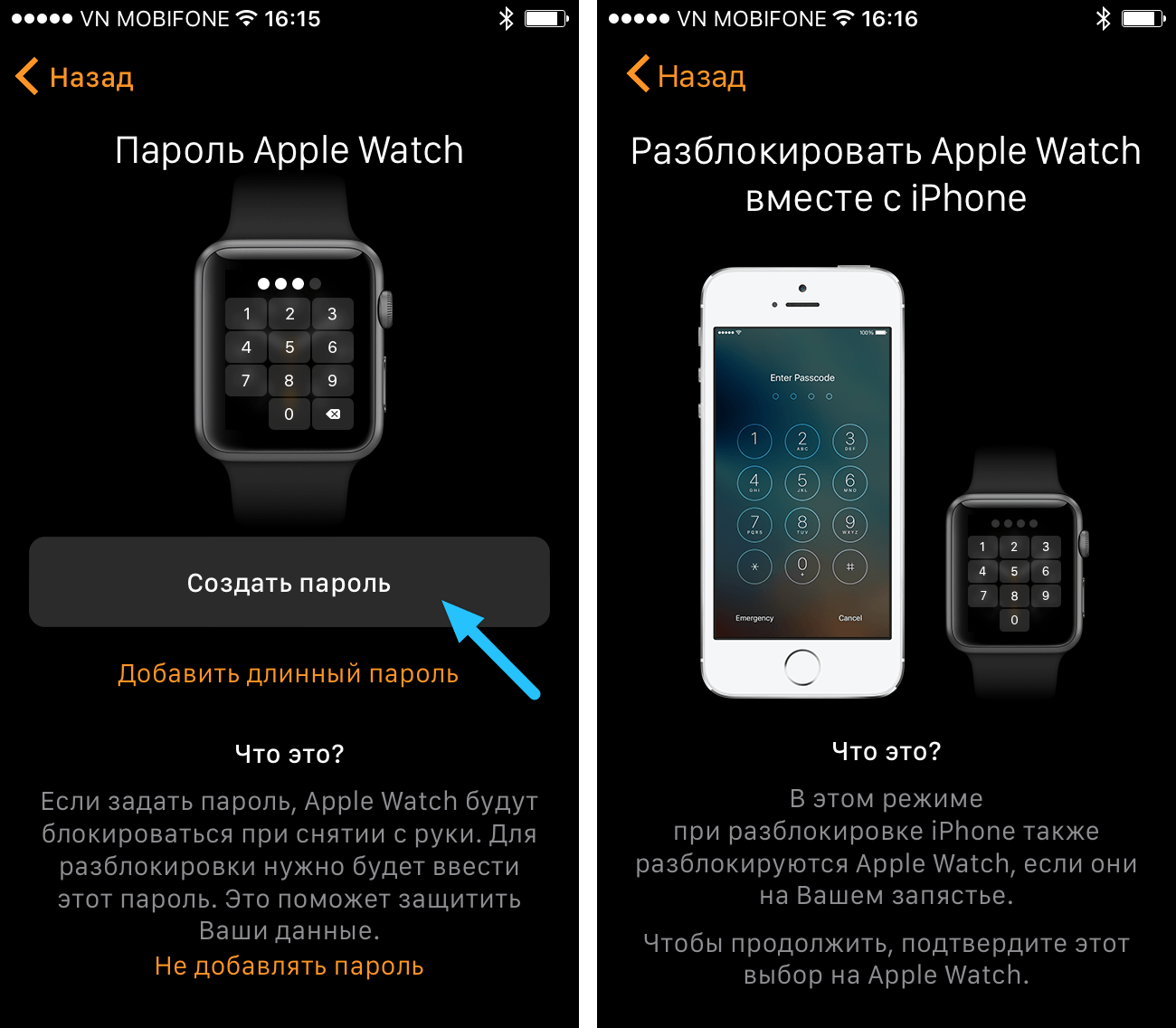 15. Добавьте или откажитесь от создания код-пароля. При при выборе варианта Добавить код-пароль, на экране Apple Watch необходимо будет ввести желаемую комбинацию цифр.