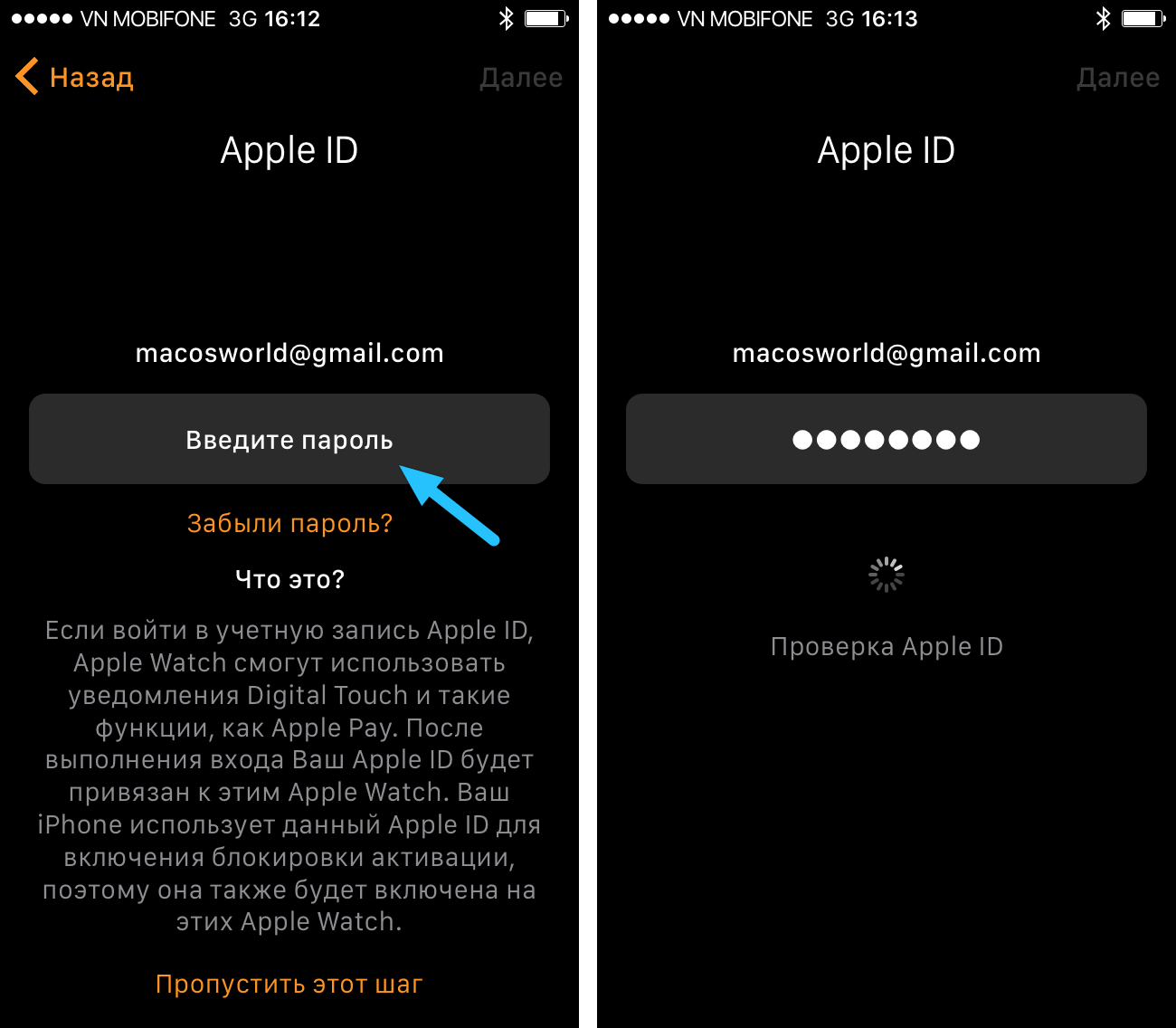 10. Введите пароль от Apple ID (который вы используете в разделе iCloud на iPhone) или пропустите этот шаг. Если этот запрос не отображается, можно выполнить вход позже в приложении Watch на iPhone по пути: Основные → Apple ID, затем войдите в систему.