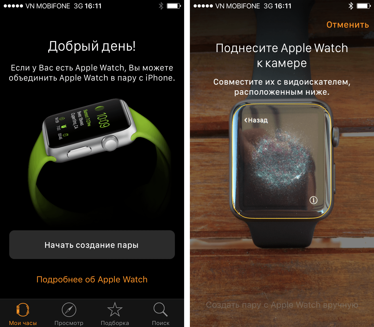 Если по каким-то причинам не удается настроить Apple Watch при помощи камеры (не отображается анимация или iPhone не может ее «прочитать») нажмите «Создать пару вручную» (см. скриншот выше) и следуйте инструкциям на экране.