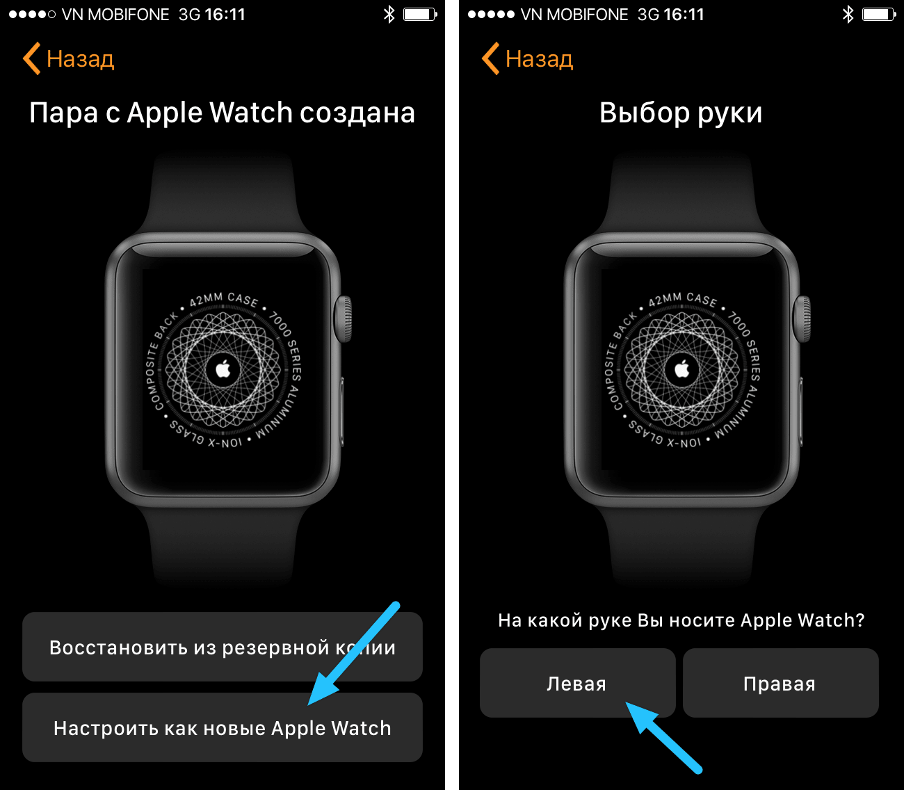 Настройка и выбор руки. Если это ваши первые часы, то нажмите «Настроить как новые Apple Watch». Если настройка выполнялась раньше, можно нажать «Восстановить из резервной копии» и следовать инструкциям на экране. Затем нажмите «Левая» или «Правая» на iPhone, чтобы выбрать руку.