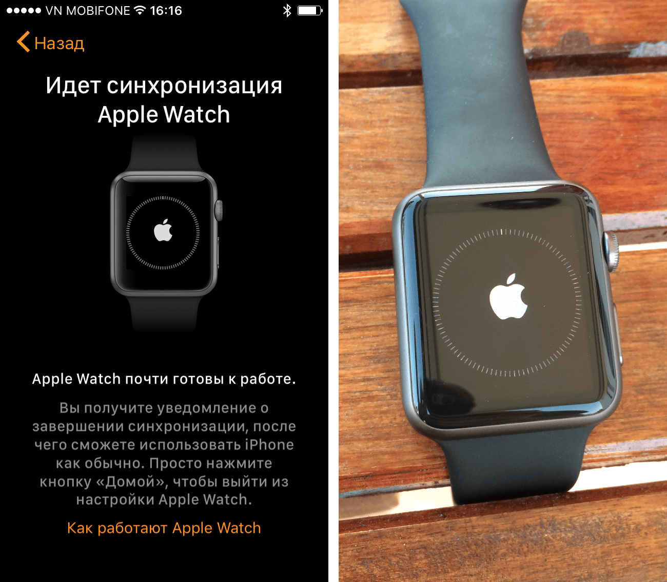 Обратите внимание, что во время синхронизации iPhone должен находиться близко к часам. По окончании вы услышите сигнал и почувствуете легкую пульсацию на Apple Watch