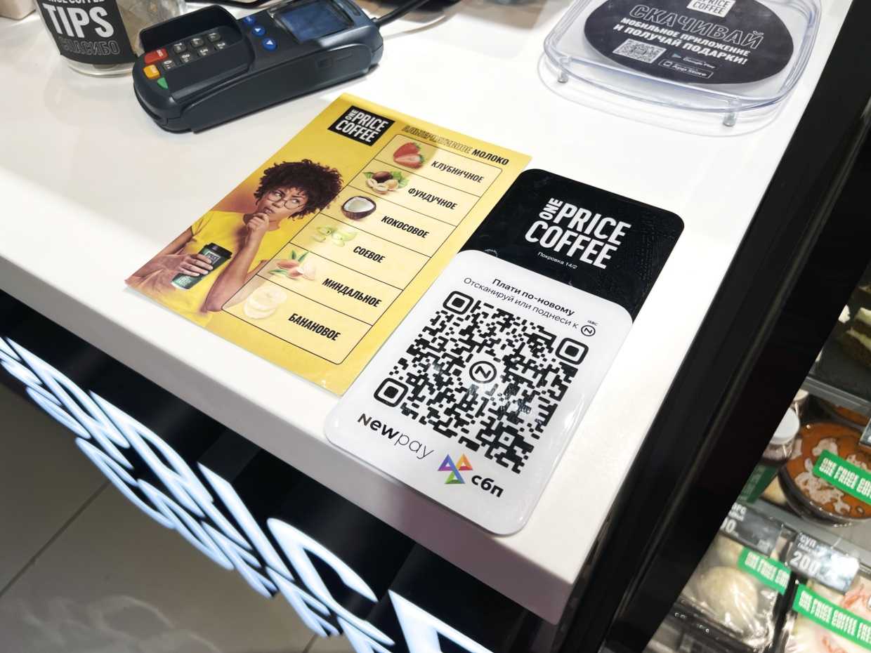 В One Price Coffee есть таблички с QR для оплаты и NFC модулем, которые работают в том числе с iPhone. Да, вы подносите смартфон, и на разблокированном экране выпрыгивает Push с ссылкой на окошко перевода в СБП. Для проведения транзакции продавец запрашивает сумму через терминал.