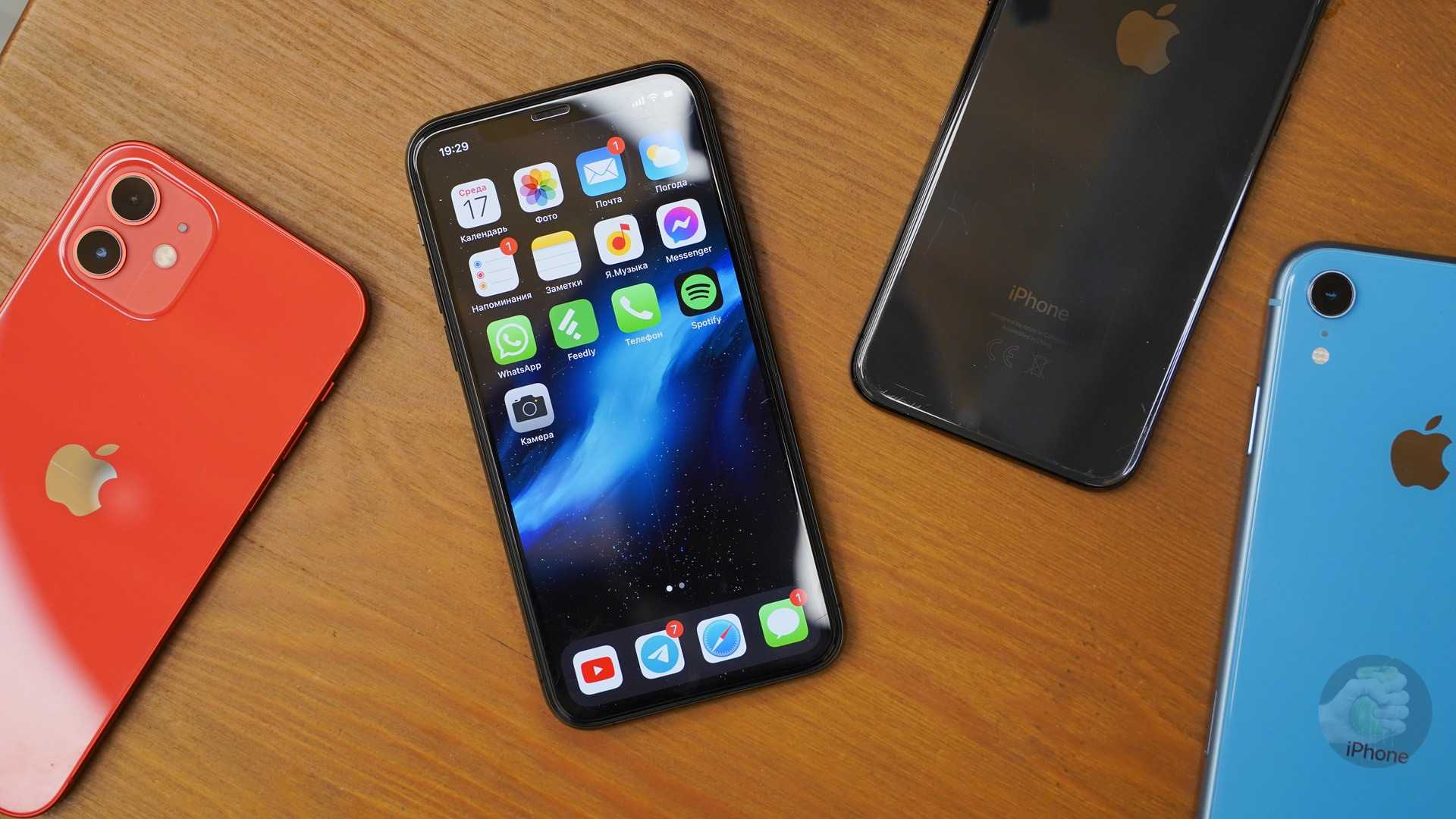 Слева направо: iPhone XS, iPhone 11 Pro, iPhone 12, iPhone XR. Фото: Александр Побыванец / Wylsacom Media