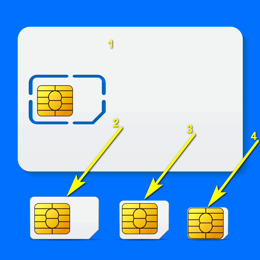 - если симка ещё не выломана из держателя, она называется просто SIM — в современных Айфонах и смартфонах на базе ОС Андроид такой формат не используется (цифра 1);