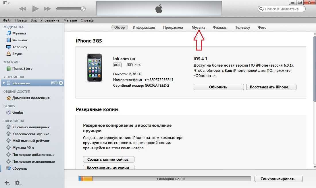 Далее выполните синхронизацию музыки в iTunes и iPhone:
