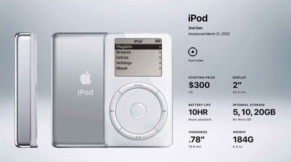 Менее чем через полгода купертиновцы выпустили второе поколение легендарного плеера. Старт продаж состоялся 21 марта 2002 года.
