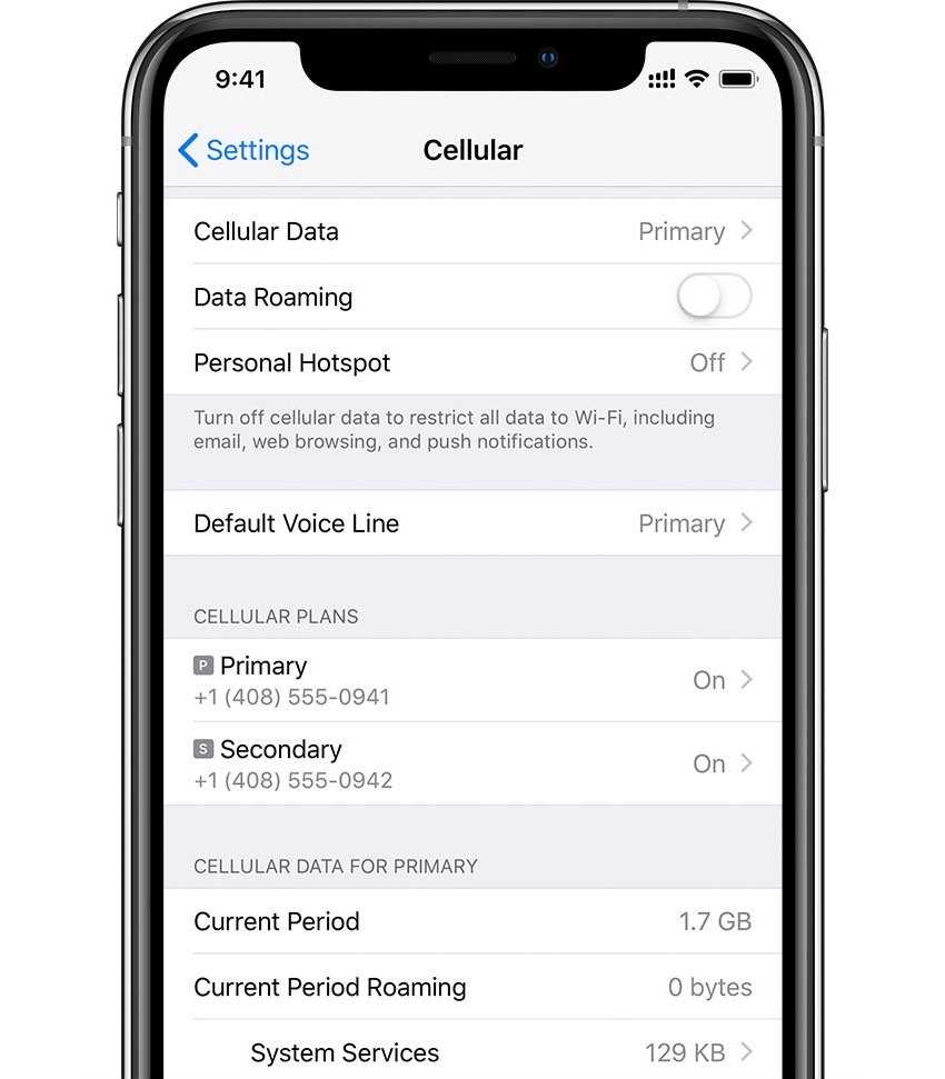 На этом экране можно выбрать номер по умолчанию или номер, который будет использоваться только для передачи данных по сотовой сети. Второй номер будет вашим номером по умолчанию. Если необходимо, чтобы устройство iPhone использовало передачу данных по сотовой сети для обоих тарифных планов в зависимости от сигнала и доступности сотовой связи, включите параметр «Разрешить переключение для сотовых данных».