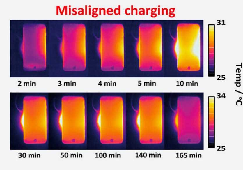 Добавляет головной боли разработчикам неровное расположение передающей и принимающей катушек. Для компенсации неровно расположенных катушек управляющий блок зарядного устройства начинает увеличивать мощность передатчика, что приводит к еще большему выделению тепла.