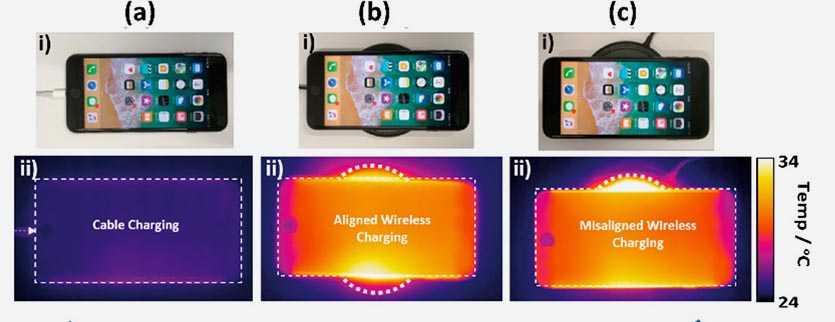 В первом случае (a) смартфон заряжался через кабель, во втором (b) на беспроводной зарядке с точно выровненными катушками, а в третьем (с) на беспроводной зарядке со смещенными катушками.