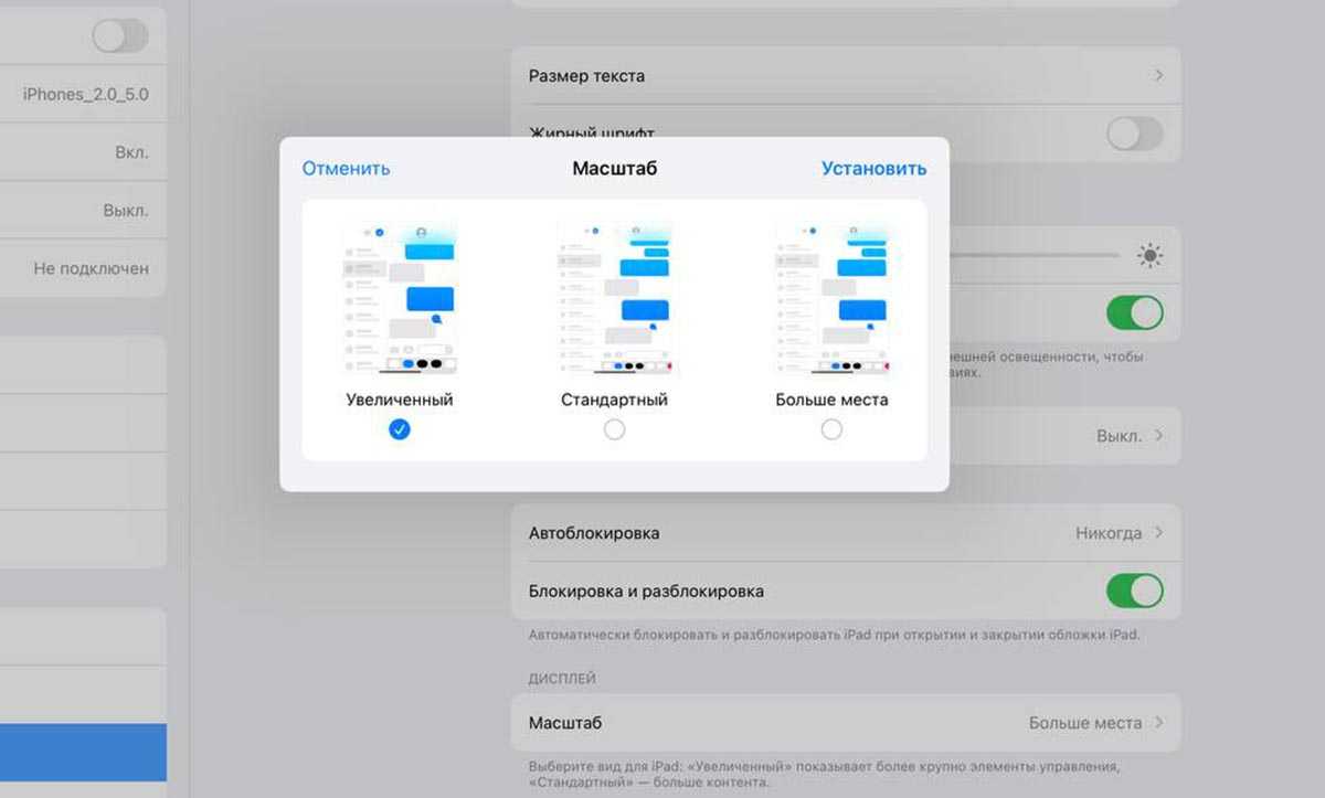 ▣ Настройки масштабирования дисплея. Для полноценной работы предыдущей опции добавлено три параметра масштабирования элементов системы. Они находятся в разделе настроек Экран и яркость и позволяют подобрать комфортную величину элементов системы для работы как на самом iPad, так и на внешнем экране.