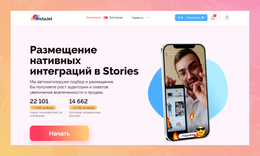 Отличный пример такой платформы — сервис нативных интеграций InstaJet.in, который функционирует в качестве маркетплейса и объединяет рекламодателей, желающих купить рекламу в сторис Instagram* с блогерами из разных регионов России.