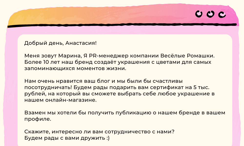 Чтобы повысить шансы на успешное сотрудничество с блогером, вне зависимости от того, ищете ли вы их на бирже или находите вручную, рекомендуется составлять короткие и чёткие письма/сообщения