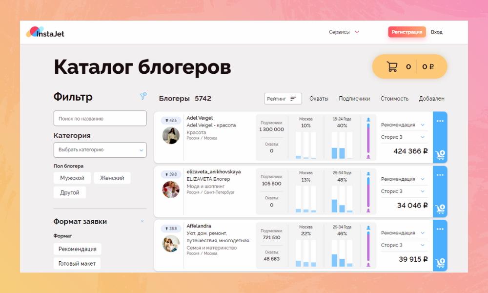 InstaJet.in предлагает удобный каталог инфлюенсеров с полной информацией о целевой аудитории и статистике их аккаунтов. Заказчики могут фильтровать блогеров по разным параметрам, опираясь на свои нужды: по тематикам, географии, стоимости просмотра и даже полу аудитории.