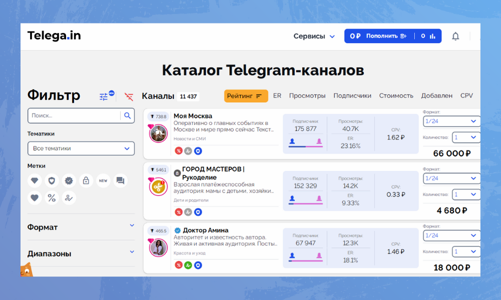 Оценить всю разнообразность тем и вариаций каналов можно, заглянув в каталог Telega.in, где собрано более 12 000 каналов на разные темы. Таким образом, каждый может подобрать именно тот канал, который отвечает его потребностям и интересам.