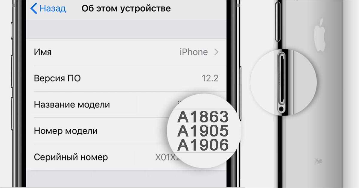 ▣ Смартфоны iPhone 8 могут иметь следующие номера моделей: A1863, A1905, A1906. Найти номер можно по пути Настройки – Основные – Об этом устройстве – Модель, на коробке и внутри корпуса под слотом для SIM-карты. Разумеется, все найденные номера должны совпадать.