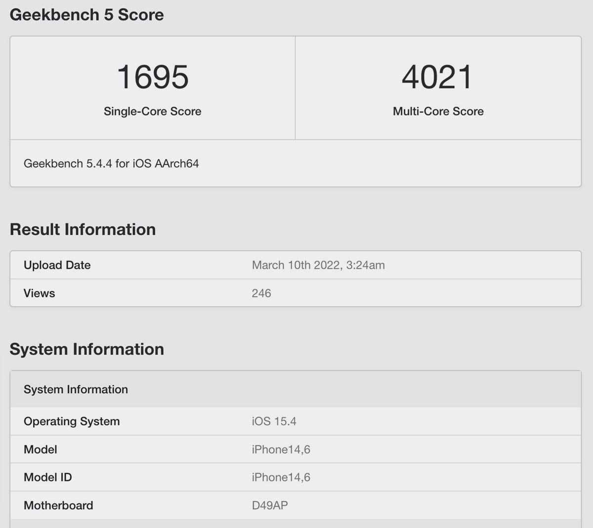 ◈ iPhone SE 2022 имеет технический номер модели “iPhone 14.6”. Он будет отображаться в любых приложениях для тестирования производительности гаджета.