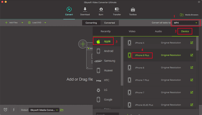 In this step, please go to the format tray and click «Device» tab. Then choose «iPhone» as the output device, here you can select your iPhone mode.
