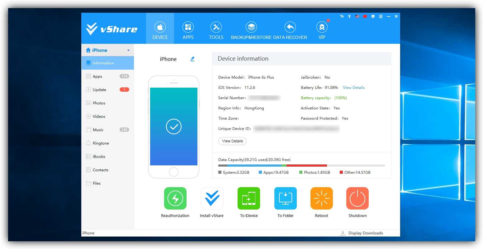 После установки vShare на мобильное устройство можно отключать последнее от компьютера и скачивать софт без помощи ПК. Но если приложение vShare перед каждой загрузкой начнёт открывать App Store, стоит снова подключить гаджет к компьютеру и нажать Reauthorization в главном меню клиента vShare для Windows.