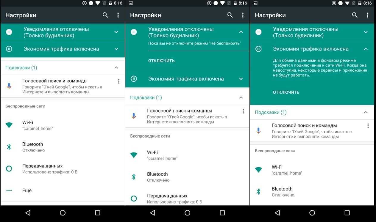 Тут же ОС отображает и важные напоминания вроде активированной экономии трафика или включенного беззвучного режима.