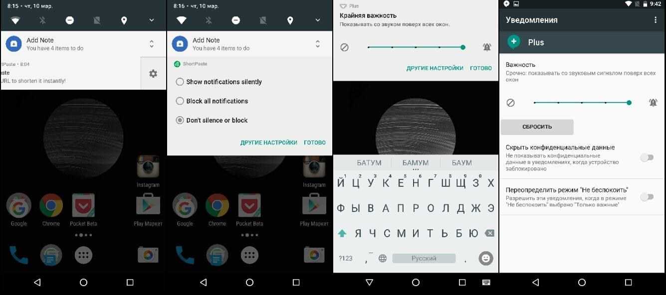 Сдвинув уведомление вправо, вы увидите иконку настроек приоритета приложения. Удобно, но предназначение непонятное — удержав палец на уведомлении, вы сделаете то же самое.