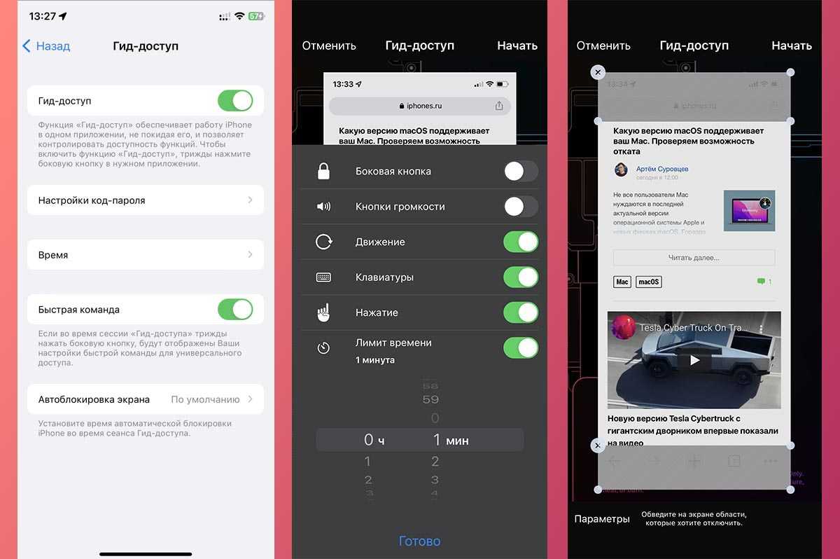 После этого запустите нужное приложение и включите Гид-доступ тройным нажатием на боковую кнопку. Перед включением можно ограничить некоторые действия (регулировку громкости, отключение экрана, вызов виртуальной клавиатуры) и сделать некоторые части дисплея невосприимчивыми к нажатиям (например, часть браузера с адресной строкой).