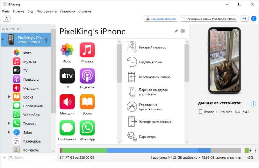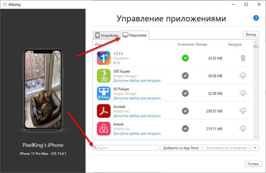 После предварительной подготовки iMazing разблокирует доступ к разделам «Устройство» (раздел содержит информацию об уже загруженных приложениях) и «Медиатека».
