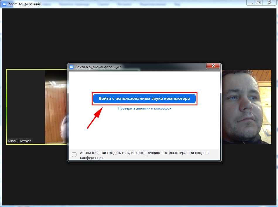 8. После одобрения организатором вы войдете в конференцию. Чтобы общаться голосом с участниками онлайн-встречи, щелкните «Войти с использованием звука компьютера».
