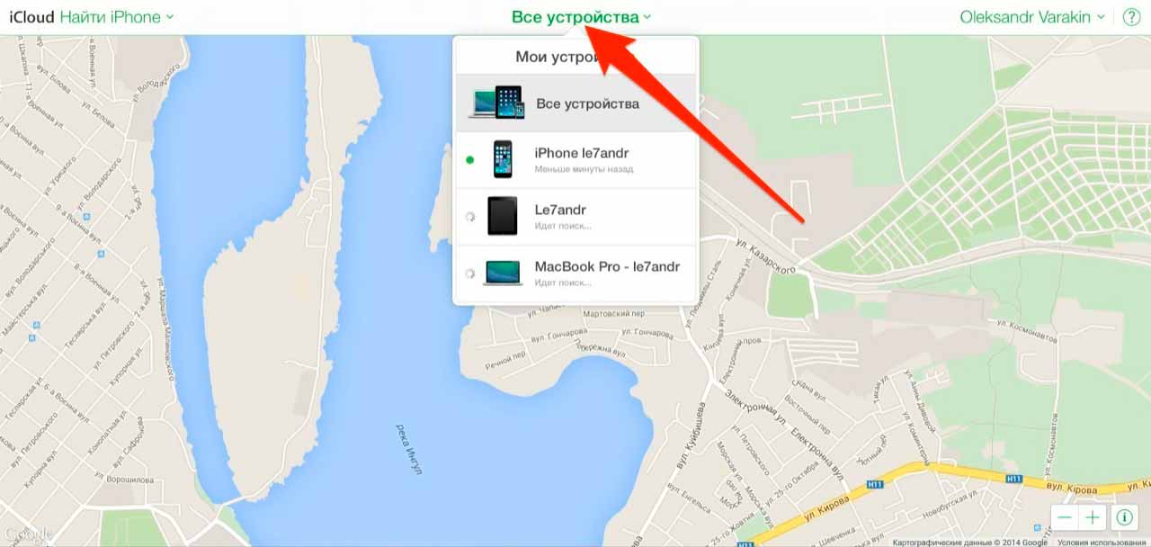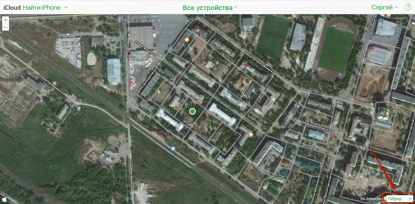 Как видим, ничего сложного. Карту можно масштабировать, выбирать её вид (спутник, карта, гибрид). Если вы большой поклонник бренда Apple и владеете несколькими такими устройствами, выбрать пропавшее можно в поле «Все устройства».
