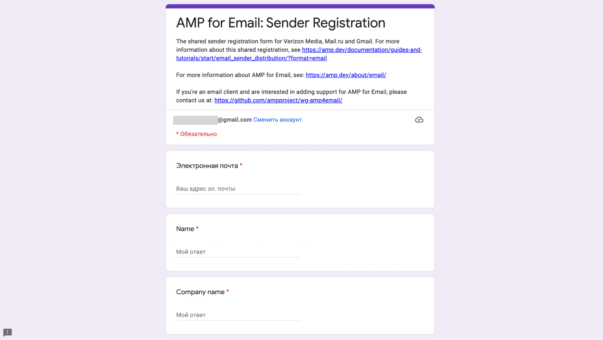 Подайте заявку на регистрацию в качестве отправителя AMP-писем