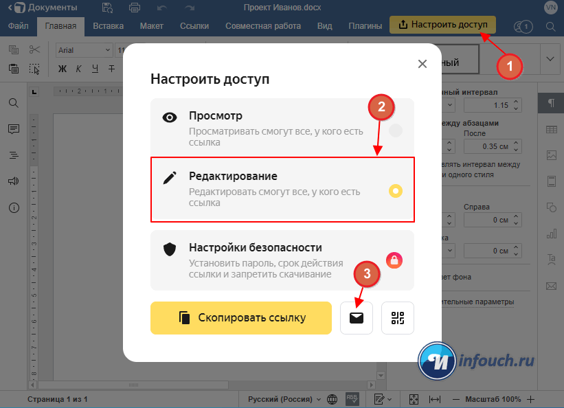 - Нажмите кнопку (маркер 3), введите адрес электронной почты тех, с кем вы хотите совместно работать над документом.