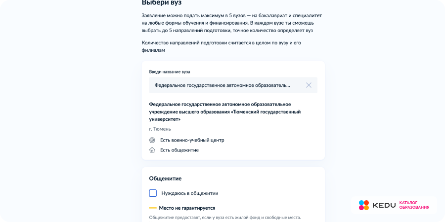 Количество вузов, куда можно одновременно подавать документы, также равняется 5. Подавая заявку на поступление, абитуриент должен определиться с приоритетами специальностей, на которые он хочет поступать. Он должен обозначить эти приоритеты цифрами от 1 до 5.