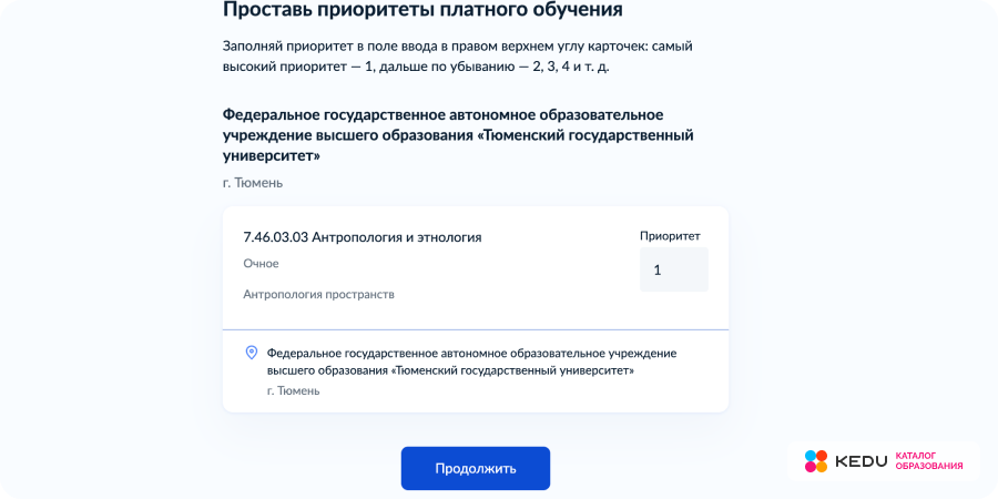Конкурс на зачисление автоматически проводится по первому приоритету. Если абитуриент по нему не проходит (например, не хватает баллов ЕГЭ), конкурс проводится по второму, третьему и дальнейшим приоритетам. Изменить указанные приоритеты можно не позднее завершения срока приема документов.